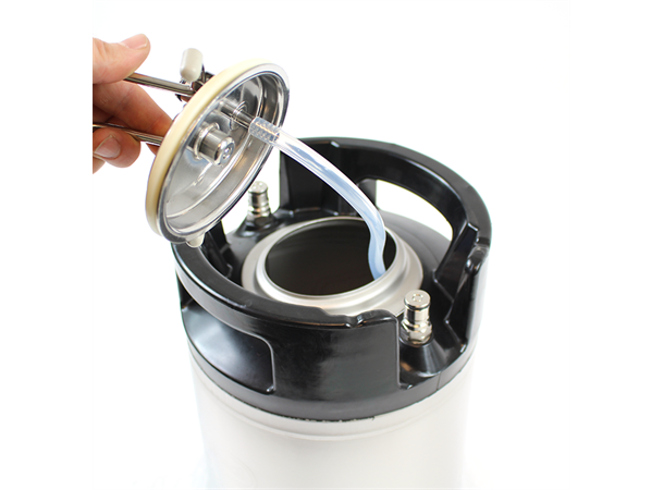 Dieser Cornelius-Deckel ist mit einem fertig montierten Kugelsperrventil und einem Schwimmer ausgestattet, der sich beim Zapfen allmählich senkt. Du zapst dann immer
