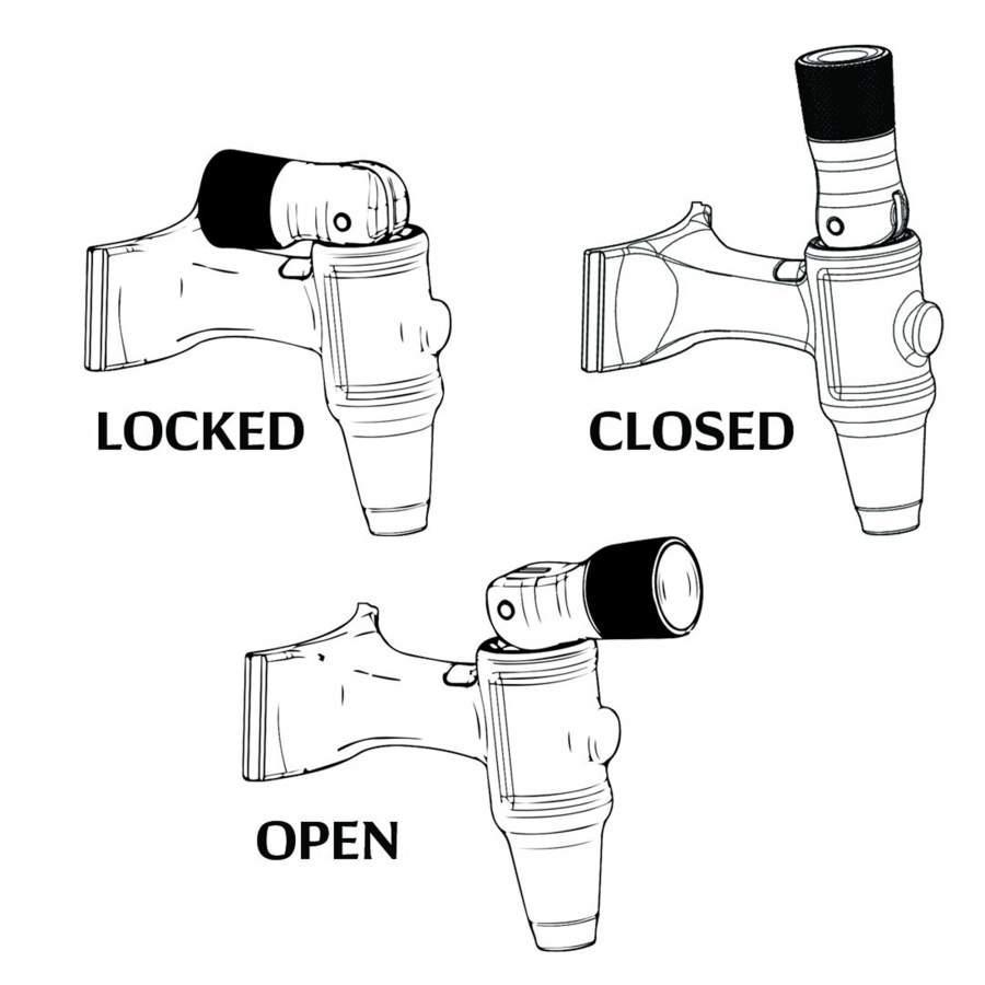 - Praktischer Hahn mit 3 Positionen: verriegeln, entriegeln, einschenken